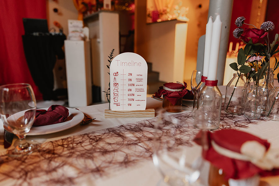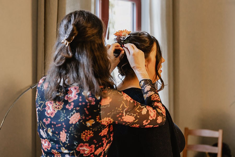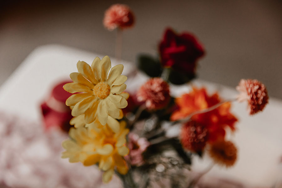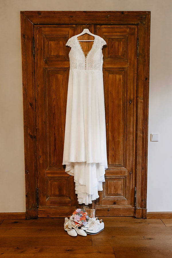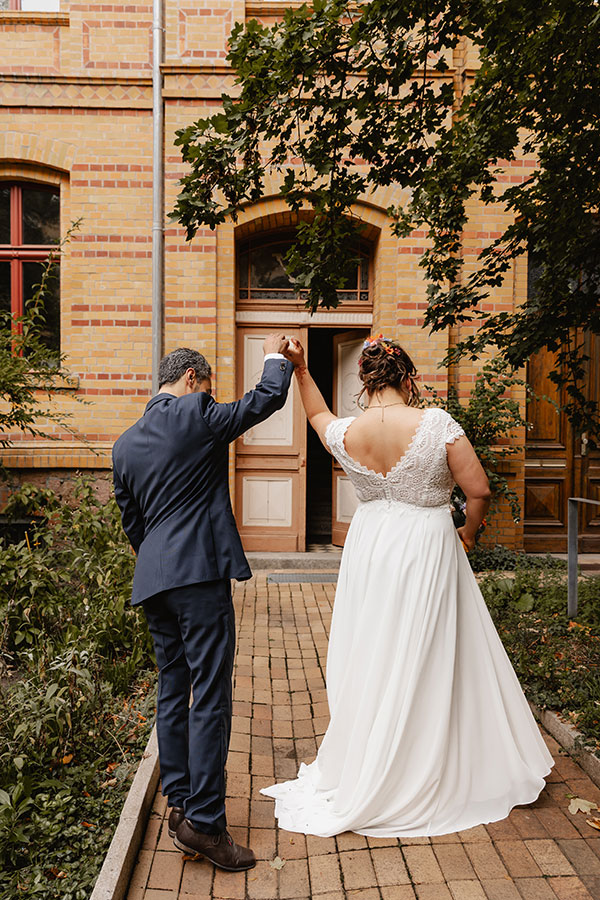Clara, Orthopädieschuhmacherin und Inhaberin der Hallenser Werkstatt "FussZone", brachte ihre Kreativität nicht nur beruflich sondern auch in ihre Hochzeit ein: Sie entwarf und fertigte ihre eigenen Hochzeitsschuhe selbst. Auch die gesamte Blumendekoration, die das Eventatelier in eine stilvolle und persönliche Kulisse verwandelte, stammte aus ihrer Hand.